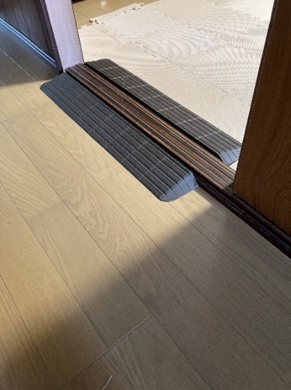 廊下と部屋との敷居の段差を解消するためのミニスロープ。→